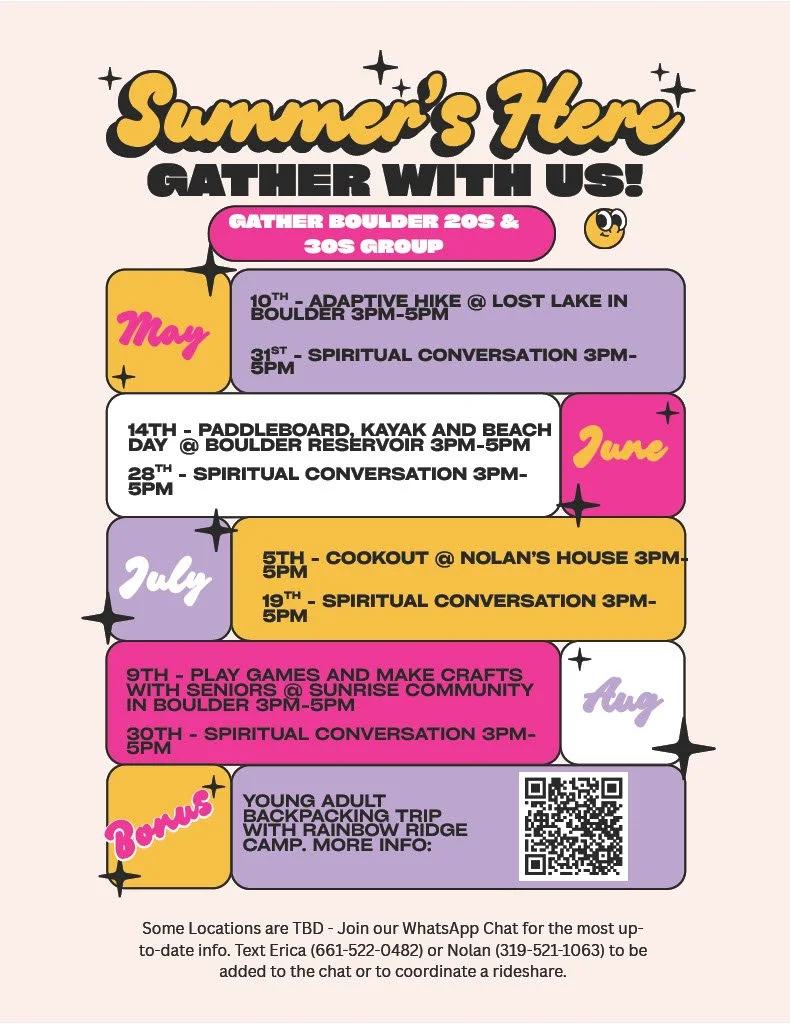 Gather Boulder is a developing and new group for young adults (20s-30s) from several local congregations. Follow on Instagram @gatherboulder for more ways to connect for community, fun, and curiosity.
